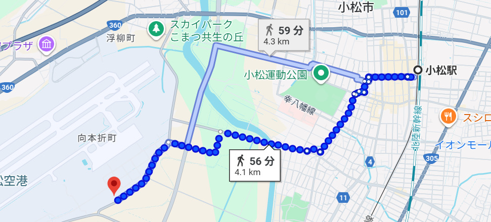 小松駅から徒歩で向かうのも可能ですが、約1時間の距離です。