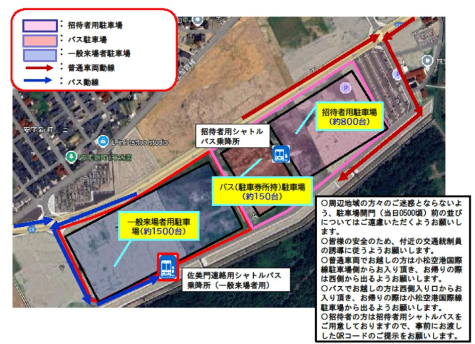 - 抽選制や事前予約制の一般駐車場は過去にもなく、来場者は臨時駐車場や、民間駐車場、公共交通機関を利用する必要があります。