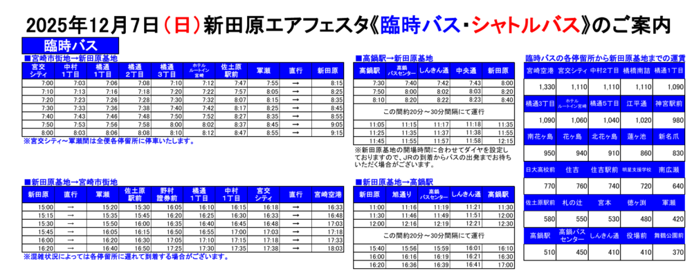宮崎駅から、基地最寄りの日向新富に向かい、そこから臨時バスに乗車する、として考えます。開門が9:00とするとバスの乗車券購入の時間も考えて、7:00~8:00頃に、日向新富駅到着とします。